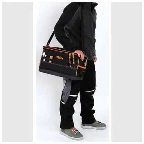 Boîte à outils vide, en tissu très résistant base rigide en matière plastique résistante à l eau. Elastiques et poches porte-outils internes et externes. Logement porte-documents intégrés dans le double-fond du couvercle.