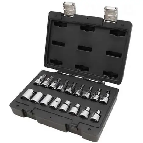Composition de 17 douilles pour vis et écrous Torx 1/2″ présentées en coffret plastique.