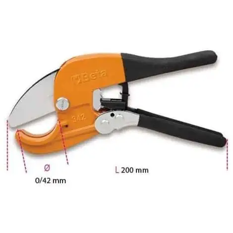 Beta : Coupe-tubes PVC à cliquet pour tubes en plastiques d’un diamètre de 42 mm maximum .