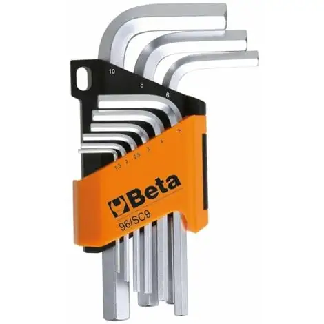 Jeu de 9 clés mâle hexagonales pliées sur support Beta 96/SC9, nouveau support avec système de verrouillage des clés. Dimensions : 1,5 – 2 – 2,5 – 3 – 4 – 5 – 6 – 8 – 10 mm.